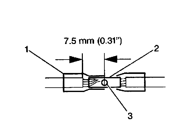 6. Place the splice sleeve in the nest. Ensure that the crimp falls midway between the end of the barrel and the stop. The sleeve has a stop (3) in the middle of the barrel (2) in order to prevent the wire (1) from going further. Close the hand crimper handles slightly in order to firmly hold the splice sleeve in the proper nest.