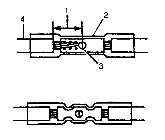 9. Insert the wires into the splice sleeve until the wire hits the barrel stop. The splice sleeve has a stop in the middle of the barrel in order to prevent the wire from passing through the splice (3).