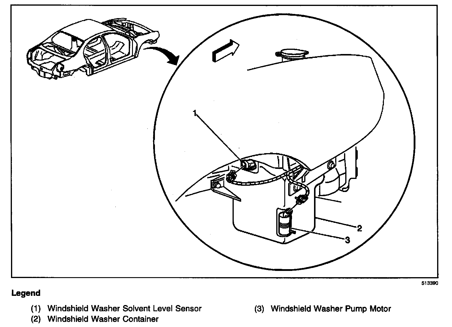 Lower right corner of the vehicle in the right front wheel well behind splash shield on top of the windshield washer container