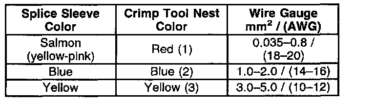 4. Select the proper sealed splice sleeve according to the wire size. Refer to the above table at the beginning of the repair procedure for the color coding of the splice sleeves and the crimp tool nests.