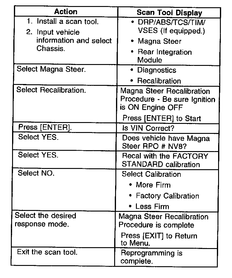 system has 3 response modes. Use a scan tool and the following table in order to select the Variable Power Steering response mode per customer request.