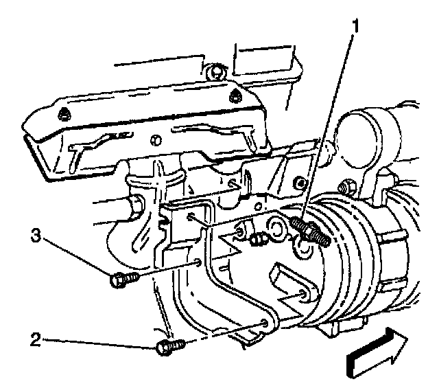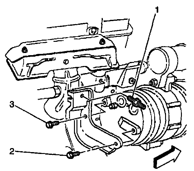 Tighten the A/C compressor rear bolts (2, 3) to 30 N.m (22 lb ft).