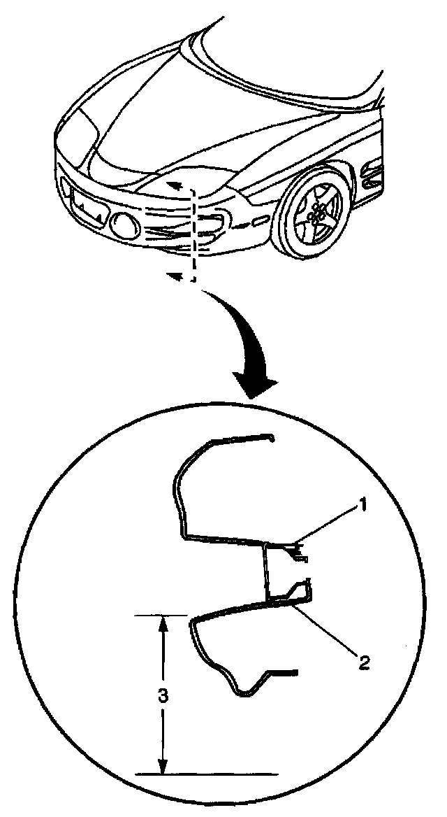 1. Calculate the trim heights (3) as measured from the ground to the bottom of the park/turn signal lamp (1) after each jounce/rebound cycle. Record your measurement.