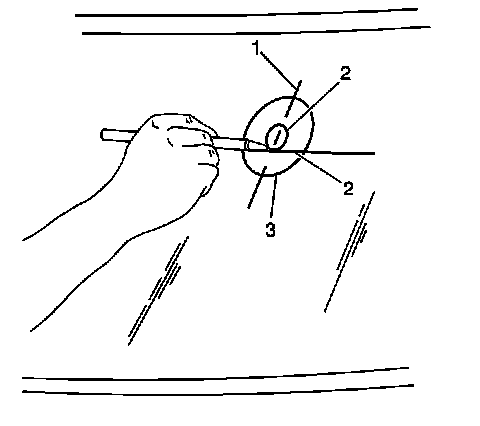 3. On the inside windshield surface, clean the large circle with paper towel and domestic scouring cleanser, GM Window Cleaner GM P/N 1050427 or polishing compound. Rub until the area is completely clean and dry. When dry, clean the area with an isopropyl alcohol saturated paper towel in order to remove any traces of the scouring powder or cleaning solution.