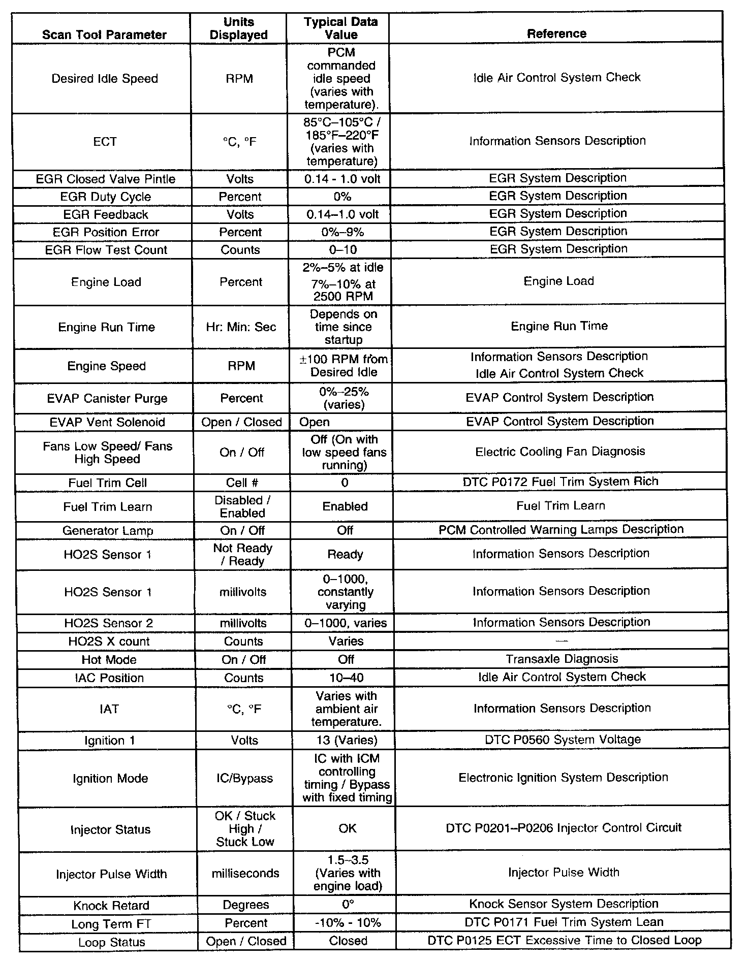 Scan tool values from a properly running engine may be used for comparison with the engine you are diagnosing. The Engine Scan Tool Data List represents values that would be seen on a normally running engine.
