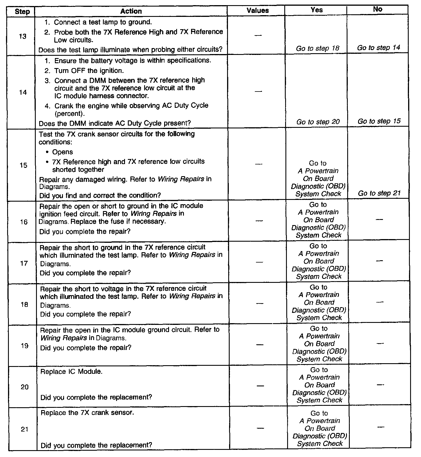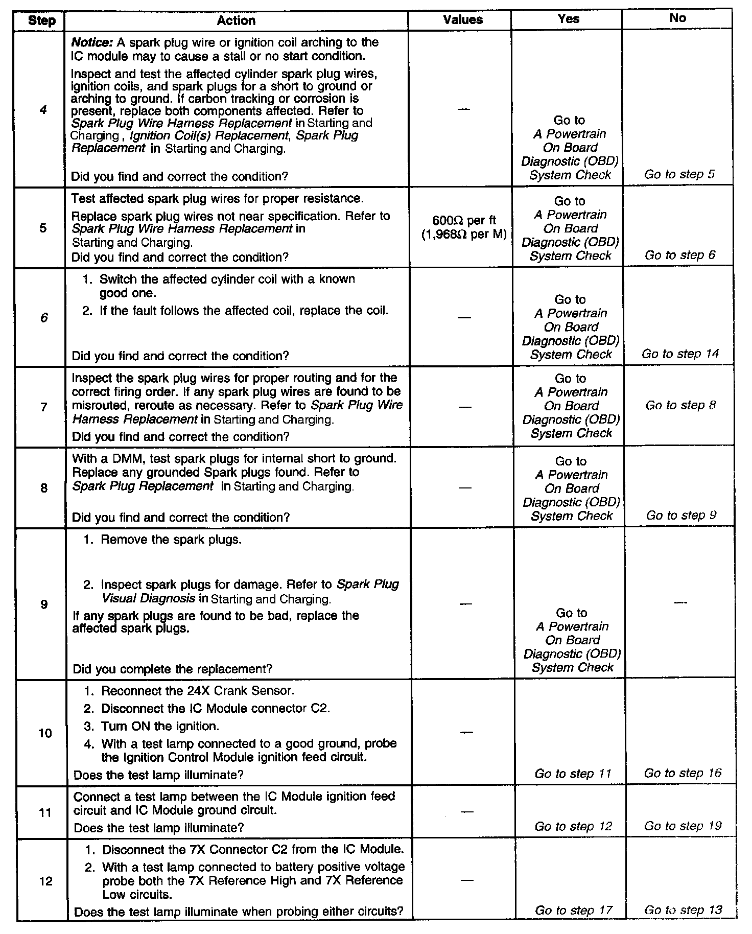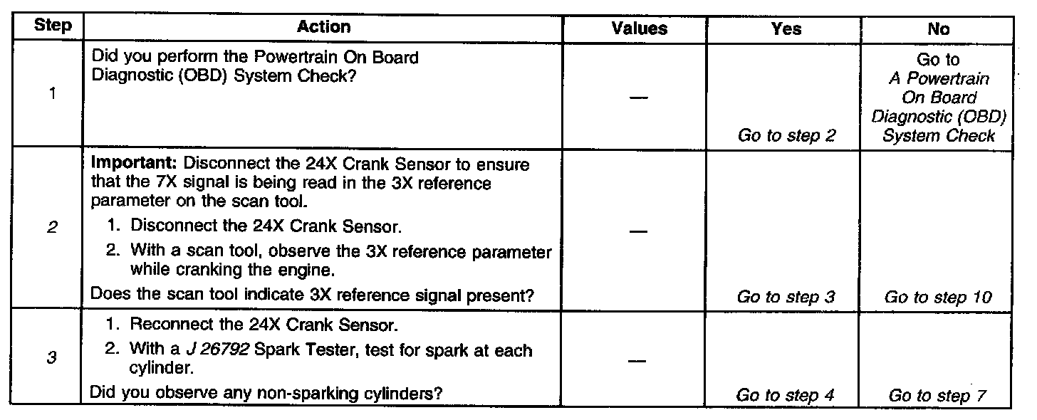 This table assumes there are no ignition system, fuel injector, cam sensor, or crank sensor DTC's present. The Electronic Ignition System Diagnosis tests for faulty ignition coils, spark plugs, plug wires, the 7X crank sensor, and IC module. This table requires the J 26792 Spark Tester.