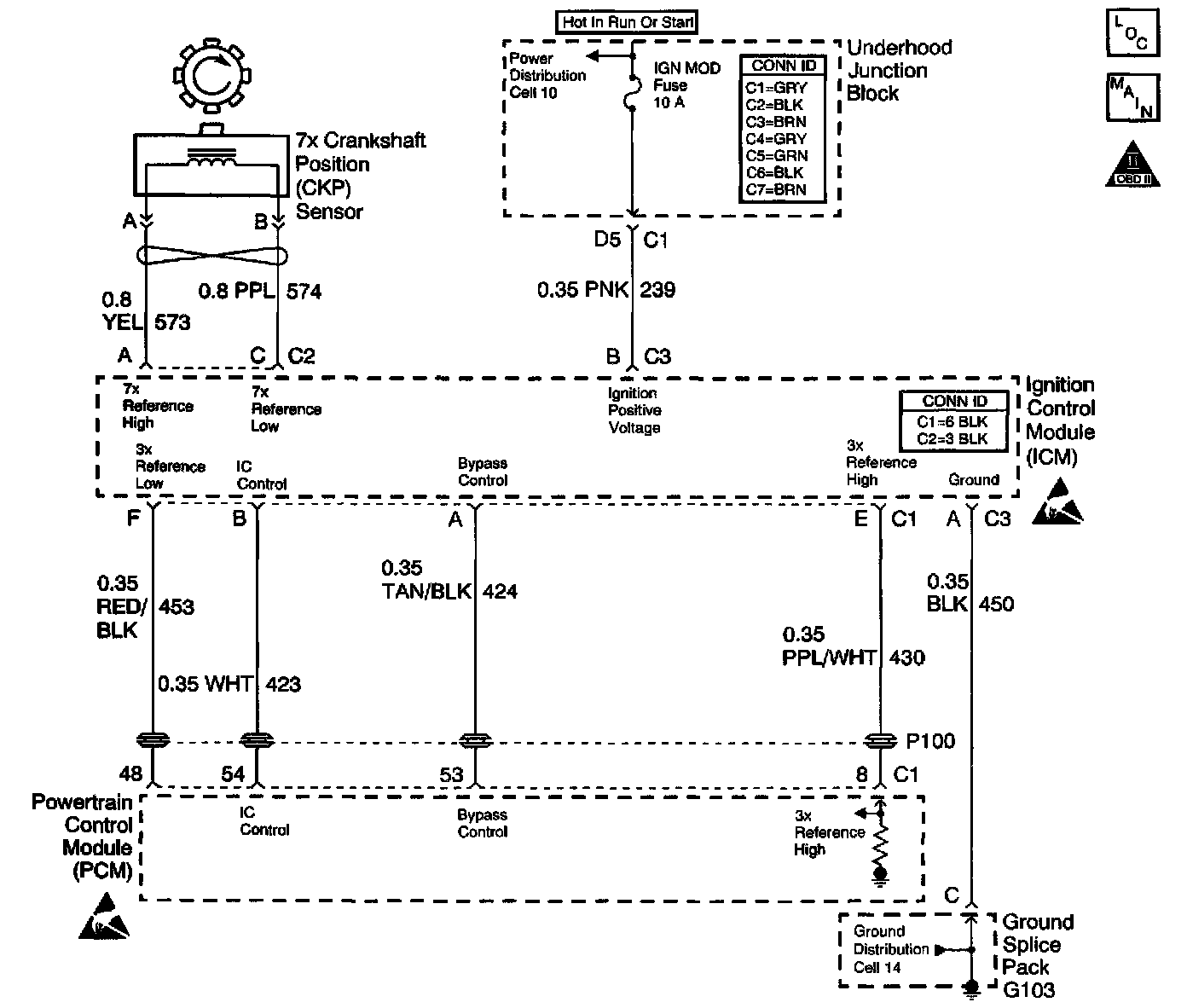 During cranking, the IC Module monitors the 7X CKP sensor input for recognition of the sync signal. The sync signal is used only by the IC Module for synchronization at start-up to determine the correct cylinder pair to spark. Once the engine speed reaches approximately 600 RPM the PCM sends 5 volts to the bypass control circuit at the IC Control Module causing the IC control circuit to become ungrounded allowing the 24X signal to be used for better low engine speed performance. At higher engine speeds (1650+) the PCM uses the 3X reference pulses to control ignition timing because a higher resolution signal is not needed.