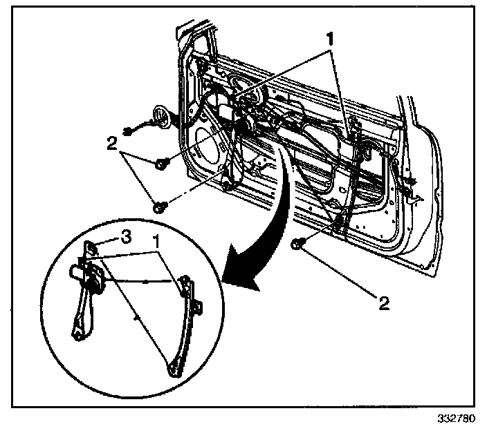 4. Remove the rear run channel bolt (2). Remove the channel (1).