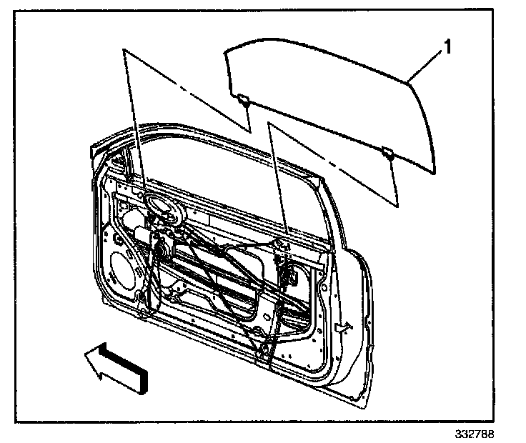 6. Remove the bolts (2) which secure the window to the regulator, including the connection switch. Position the glass.