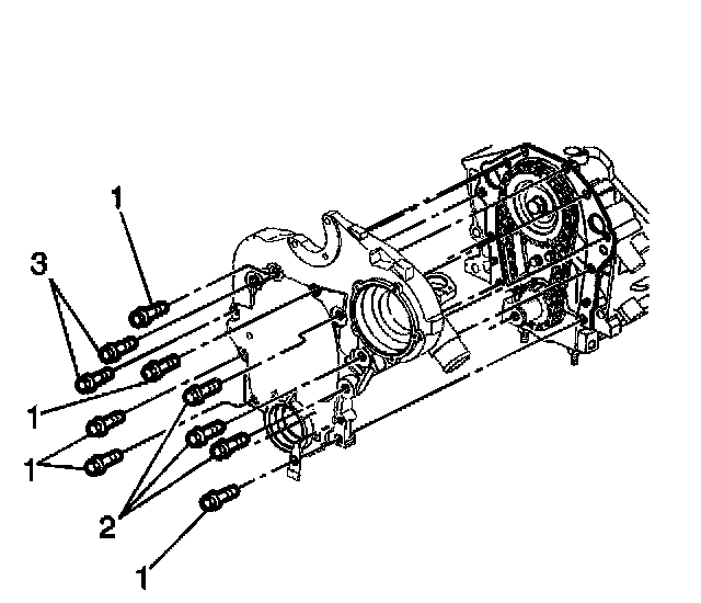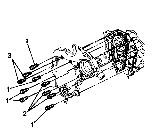 12. Remove the engine front cover bolts (1, 2 and 3).