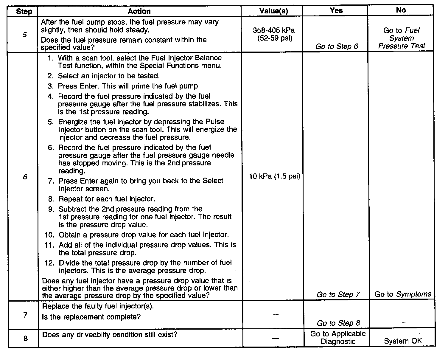 6. If the pressure drop value for each fuel injector is within 10 kPa (1.5 psi) of the average pressure drop value, the fuel injectors are flowing properly. Calculate the pressure drop value for each fuel injector by subtracting the second pressure reading from the first pressure reading.