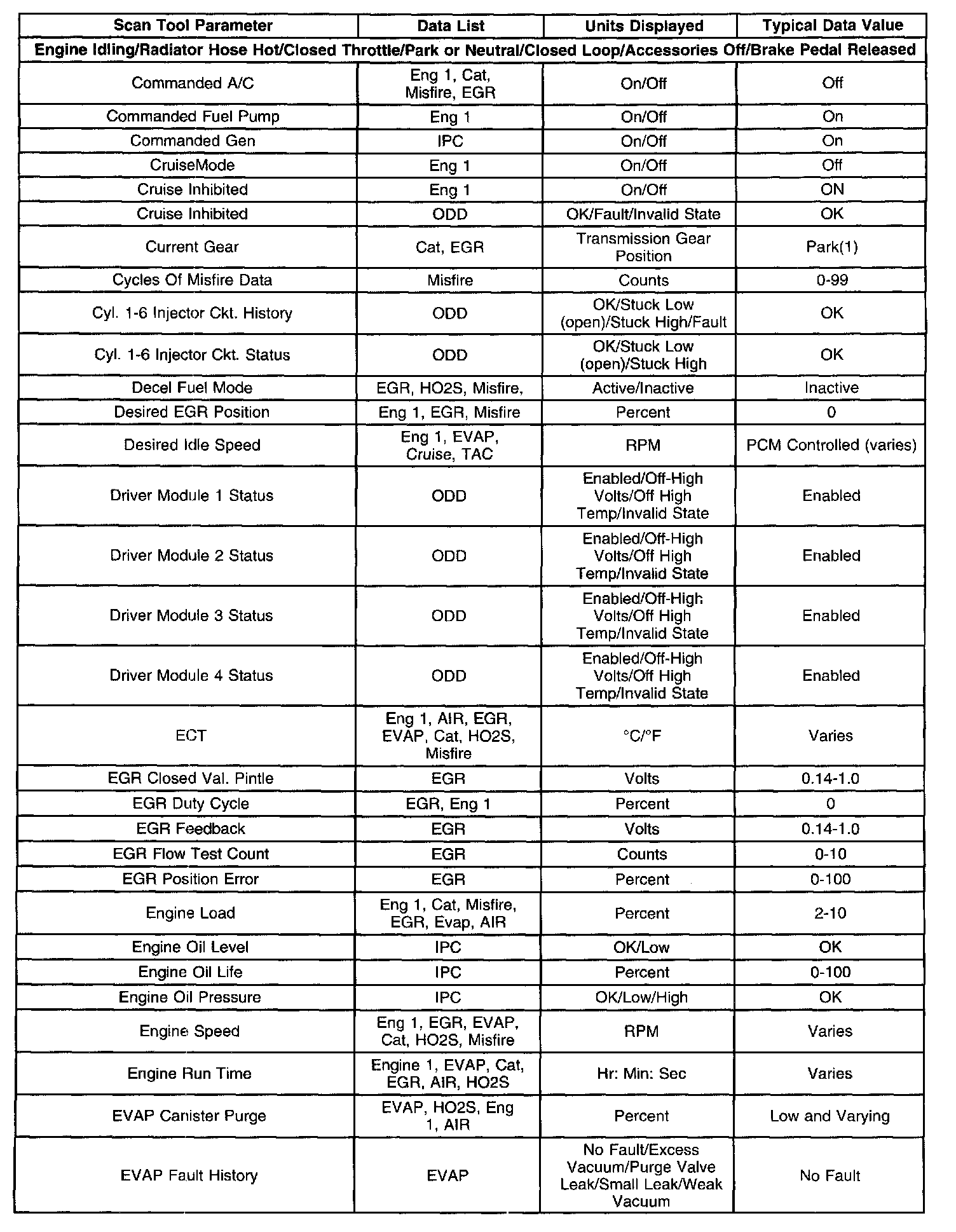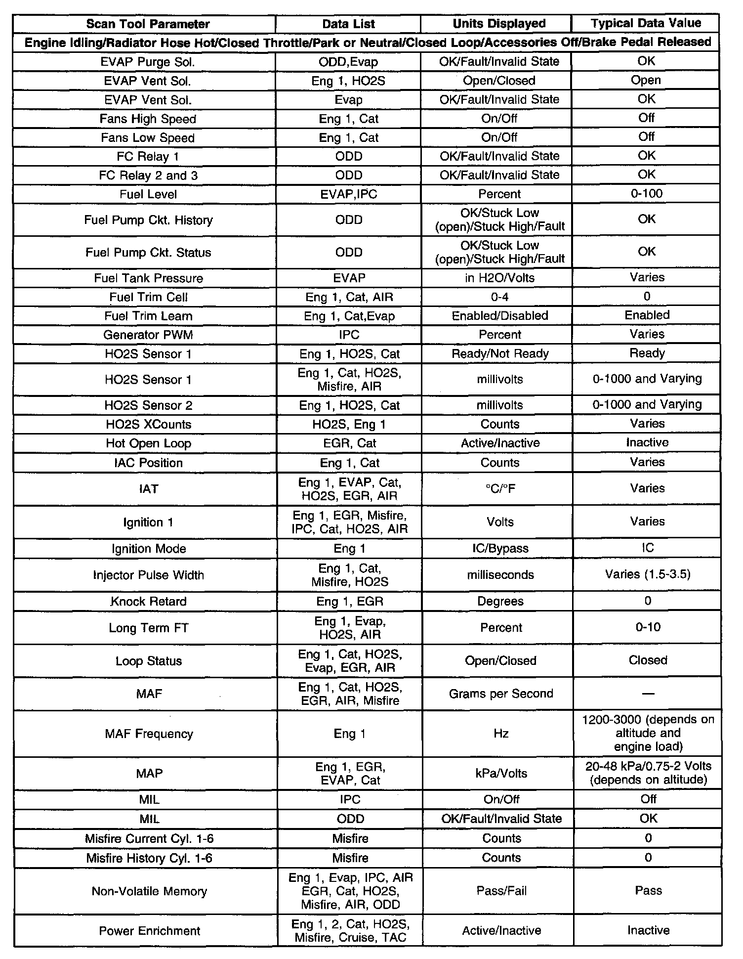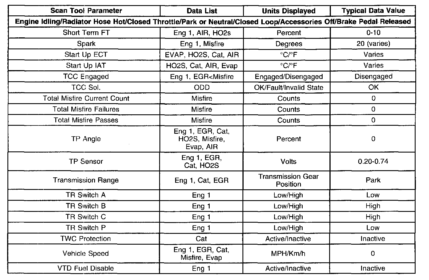 The Engine Scan Tool Data List contains all engine related parameters that are available on the scan tool. The list is arranged in alphabetical order. A given parameter may appear in any one of the data lists, and in some cases may appear more than once, or in more than one data list in order to group certain related parameters together.