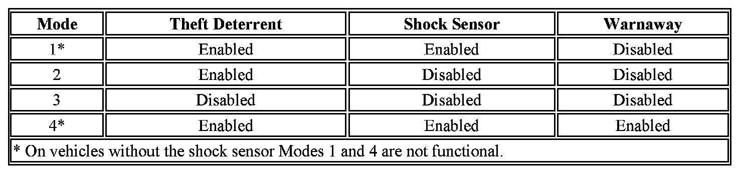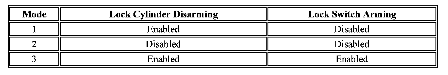 Mode 2 provides increased security, but the only way to disarm the system is to press unlock on the keyless entry transmitter. This can cause difficulty if the keyless entry transmitter is damaged or lost, or if the transmitter fails to operate. When the system is armed, the content theft deterrent system's fuel disable feature prevents the engine from starting.