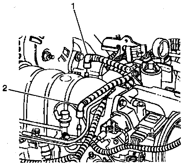 13. Disconnect the fuel lines (1, 2) from the fuel rail. Lay the fuel lines aside. Refer to Fuel Hose/Pipes Replacement (Filter to Engine).