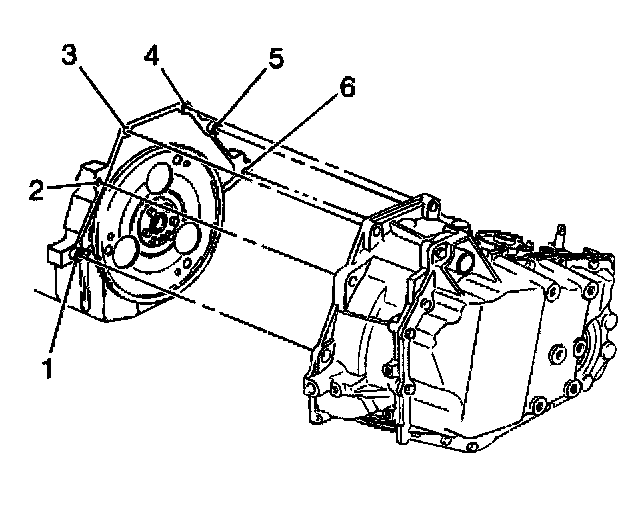 7. Install the upper transaxle-to-engine bolts (3, 4 and 5) and stud (2).