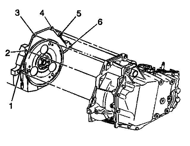 10. Install the lower transaxle-to-engine bolt (6) and stud (1).