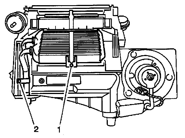 19. Remove and discard the heater core upper seal (2) from the HVAC lower case.