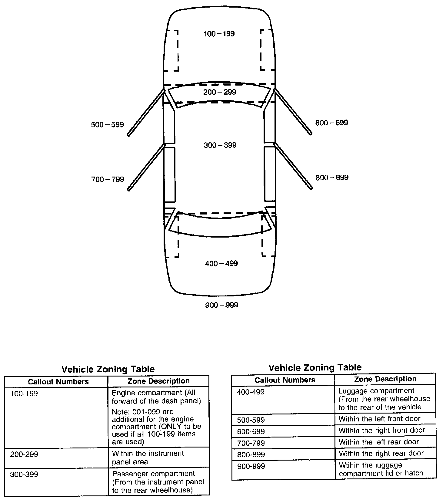All grounds, in-line connectors, pass-through grommets, and splices have identifying numbers that correspond to where they are located in the vehicle. The following table explains the numbering system.