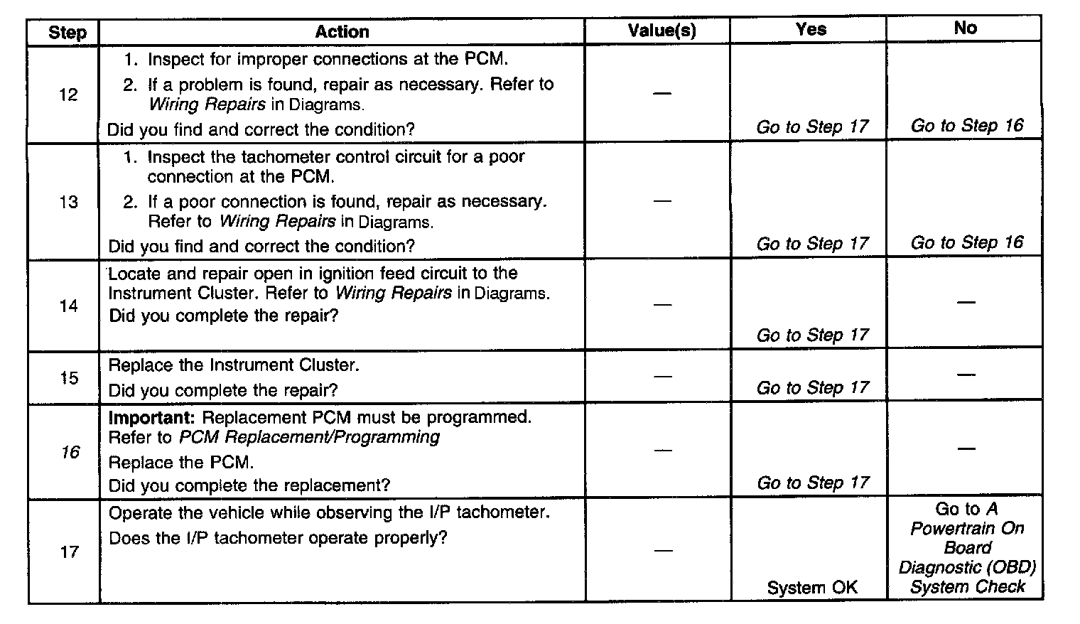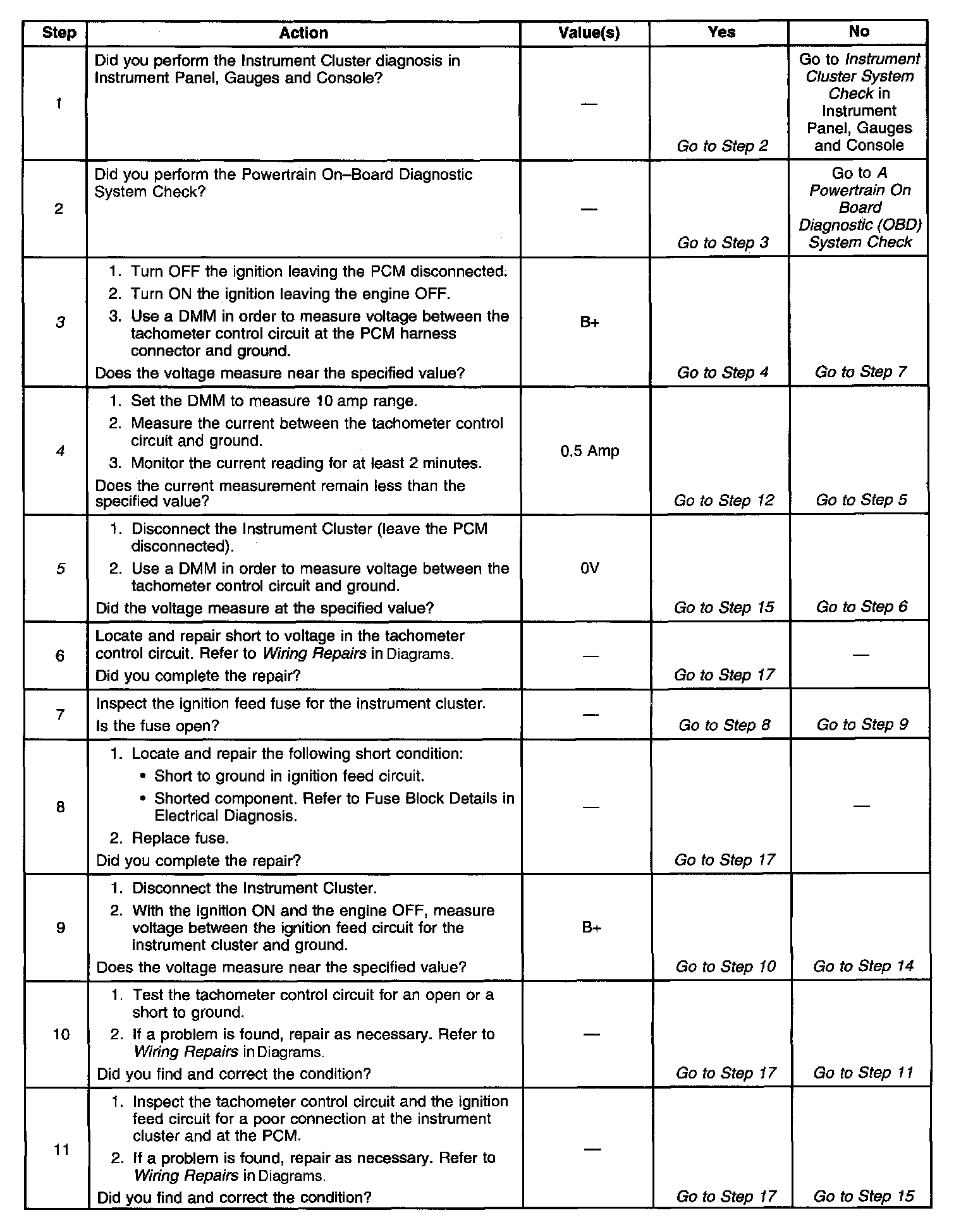^ Damaged harness. Inspect the wiring harness for damage. If the harness appears to be OK, disconnect the PCM, turn the ignition ON and observe a Digital Multimeter (DMM) connected to the tachometer control circuit at the PCM harness connector while moving connectors and wiring harnesses related to the tachometer control circuit. A change in voltage will indicate the location of the fault.