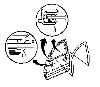 1. The glass run channel outboard lip at the rearview mirror is rolled over or the glass run channel outboard lip at the center pillar is rolled over (2).