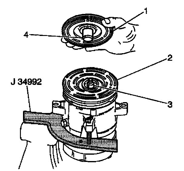 NOTE: Do not drive or pound on the clutch hub or the shaft. Internal damage to the compressor may result.
