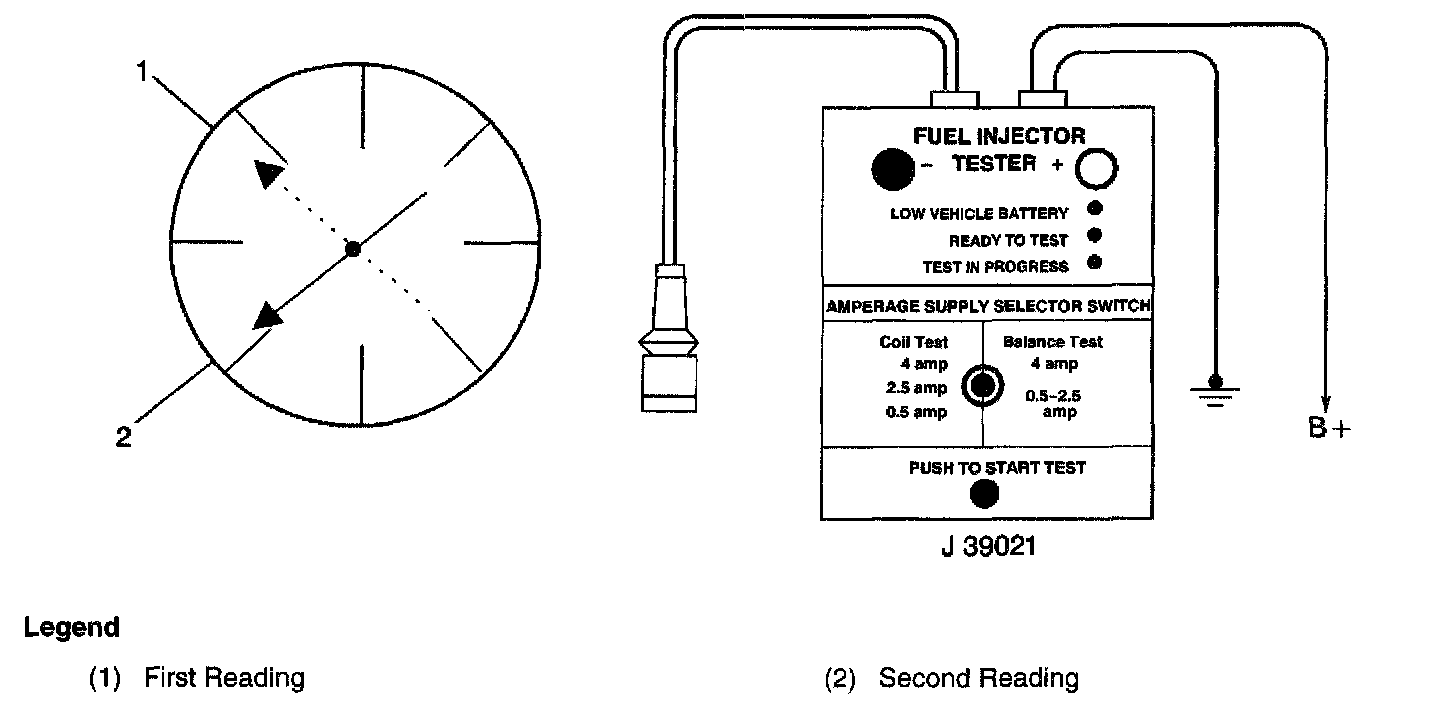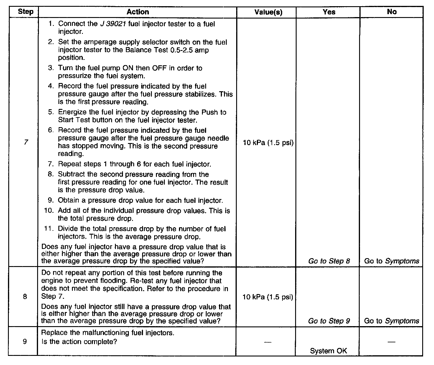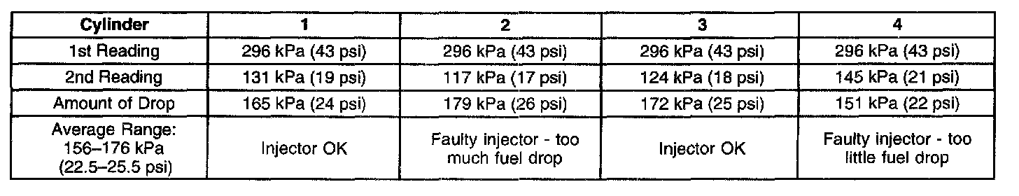 7. If the pressure drop value for each fuel injector is within 10 kPa (1.5 psi) of the average pressure drop value, the fuel injectors are flowing properly. Calculate the pressure drop value for each fuel injector by subtracting the second pressure reading from the first pressure reading Refer to the illustration above.