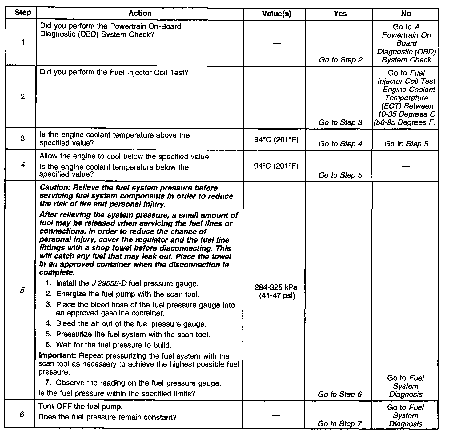 5. The fuel pressure should be within the specified range. If the fuel pressure is not within the specified range, go to Fuel System Diagnosis