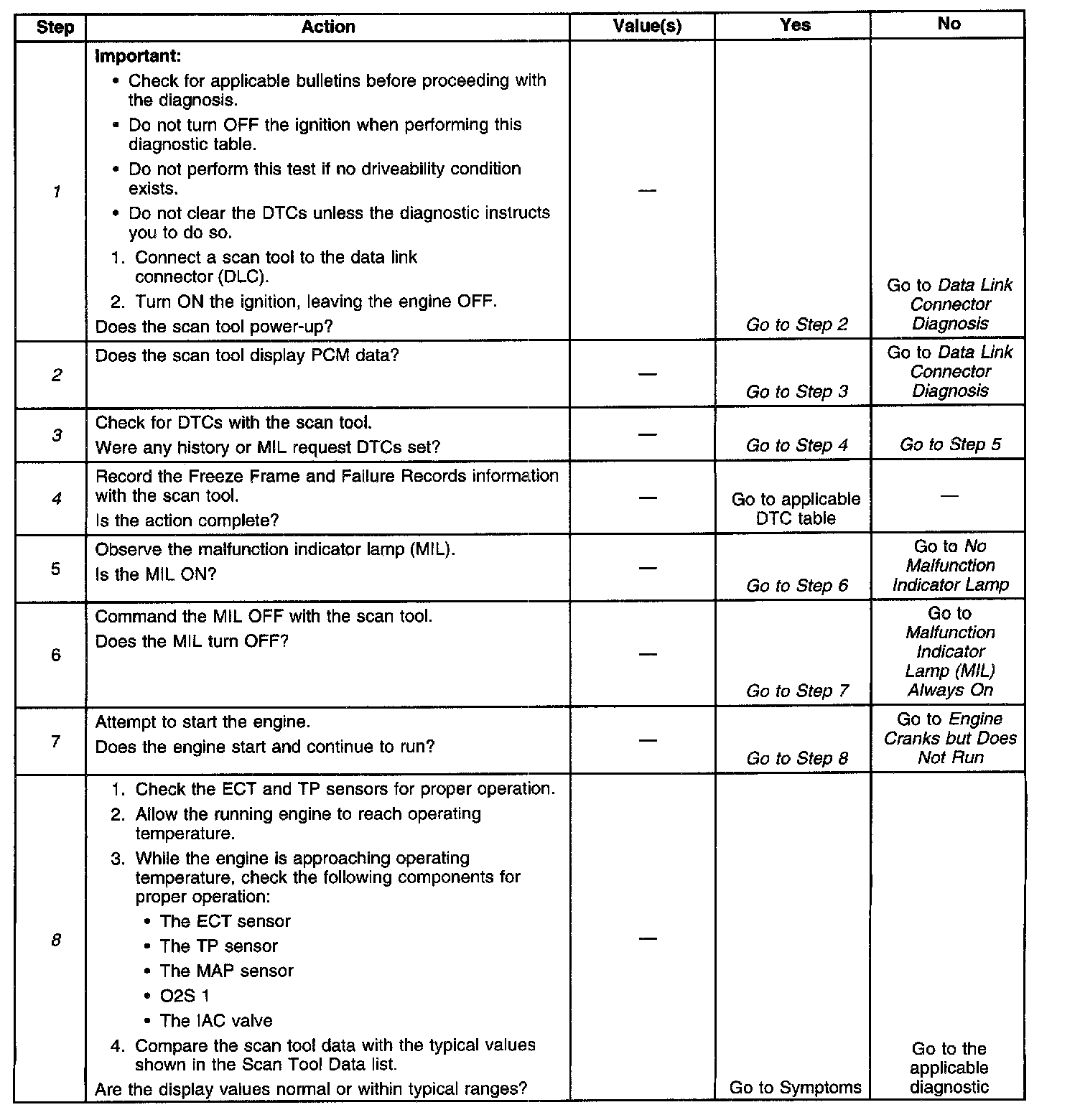 The Powertrain On-Board Diagnostic (OBD) System Check is an organized approach to identifying a problem created by an electronic engine control system malfunction. The Powertrain OBD system check is the starting point for any driveability complaint diagnosis. This directs the service technician to the next logical step in order to diagnose the complaint. Understanding the table and using it correctly will reduce diagnostic time, and will prevent the replacement of good parts.