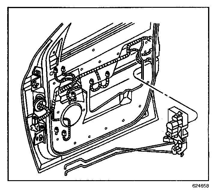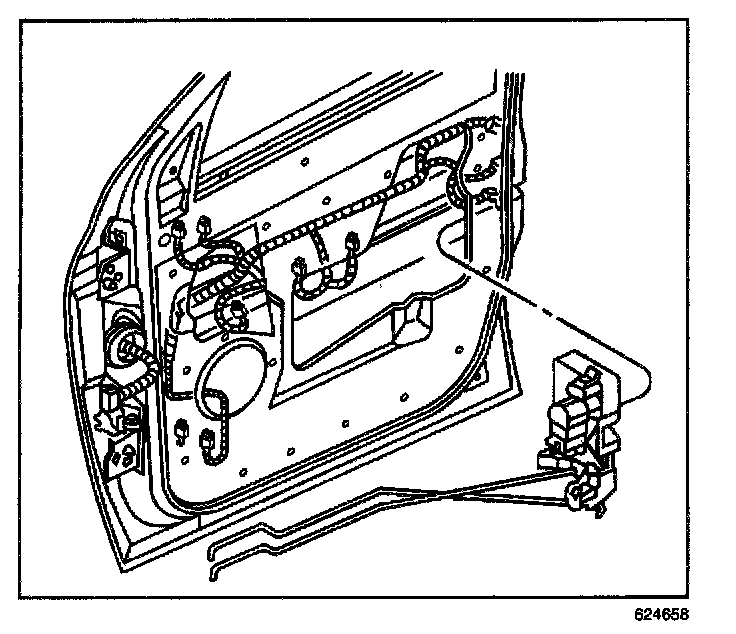 7. Remove the lock with the inside handle rods attached to the lock through the access hole in the front door inner panel.