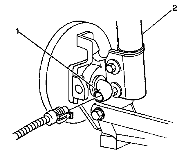 1. Connect the rear wheel speed sensor jumper harness connector (1) to the wheel speed sensor, located next to the rear strut (2).