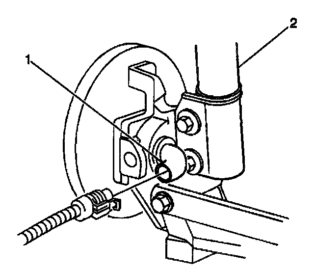 4. Disconnect the rear wheel speed sensor jumper harness connector (1) from the wheel speed sensor, located next to the rear strut (2).