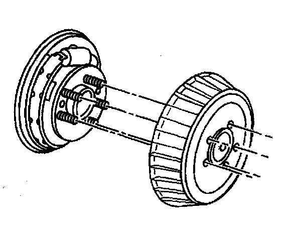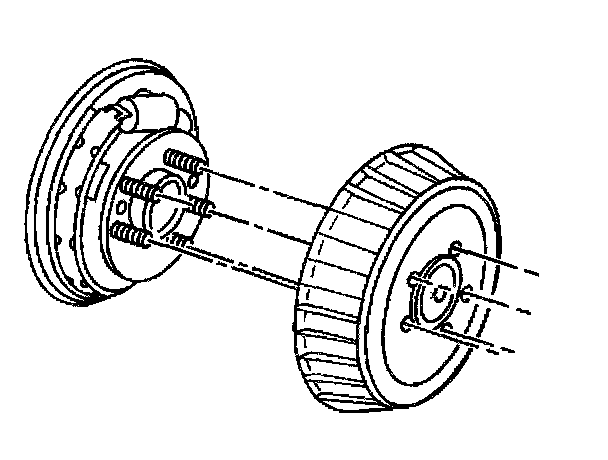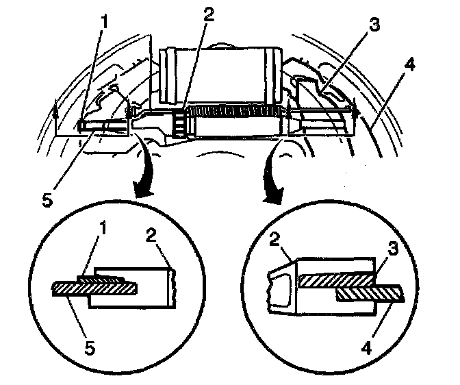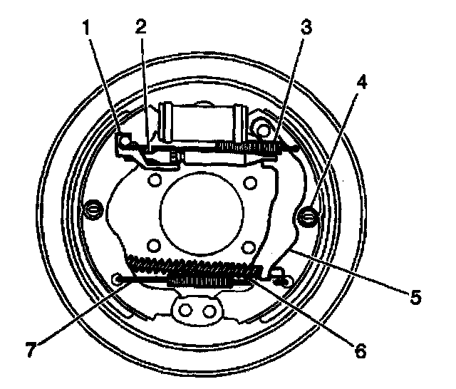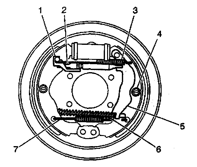 6. Remove the brake shoe hold-down springs and retainers (4) from the brake shoes.