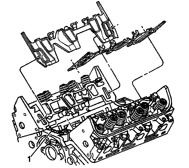 1. Apply 8 - 12 mm (0.08 - 0.11 inch) bead of RTV Sealer GM P/N 12345739 or equivalent on each ridge where front and rear of the lower intake manifold contact the engine block (1).