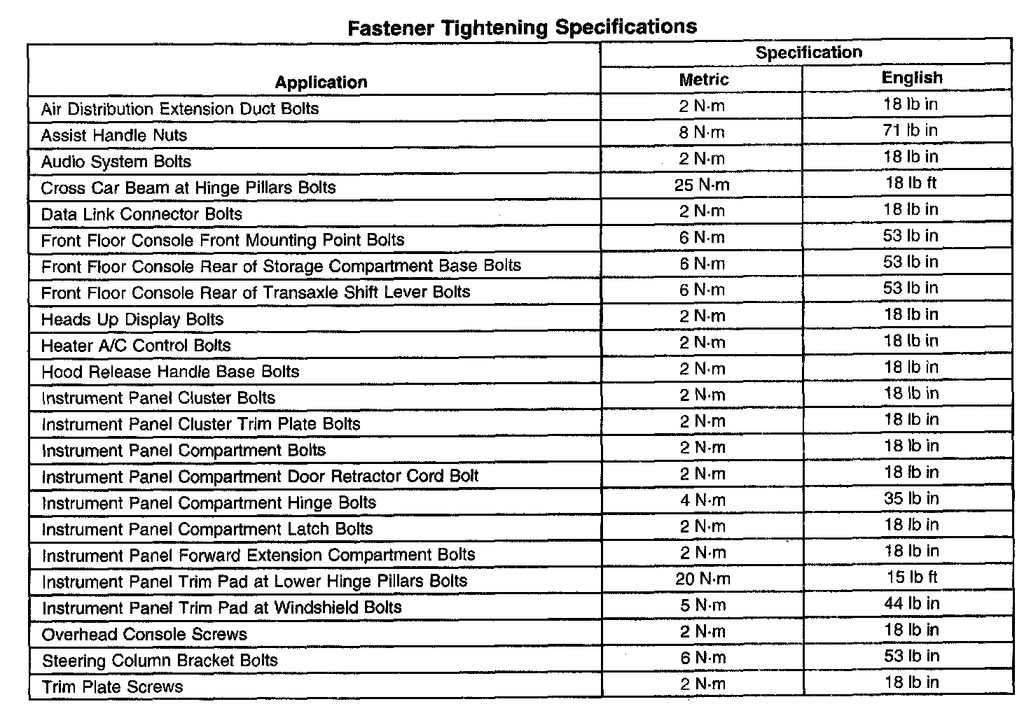 Instrument Panel, Gauges and Warning Indicators: Specifications
