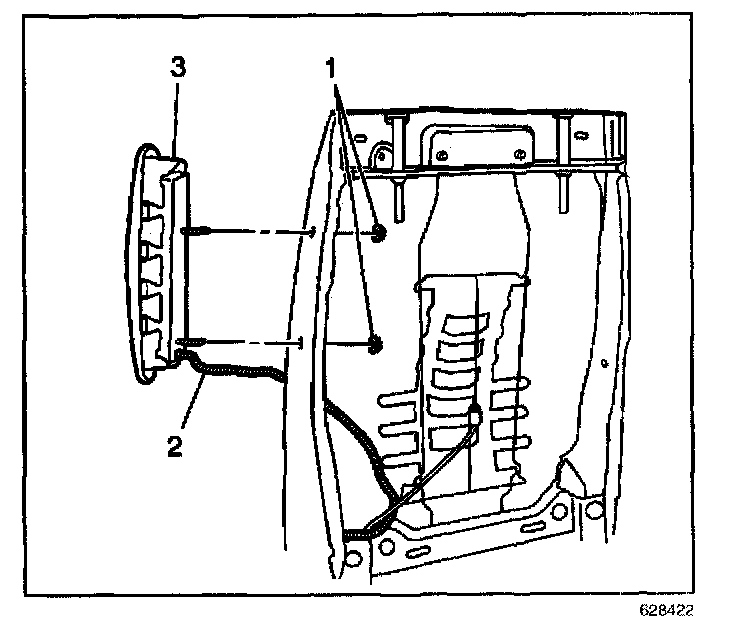 1. Install the driver side air bag (3) to the seat while guiding the driver side air bag wiring harness (2) through the trip cup.