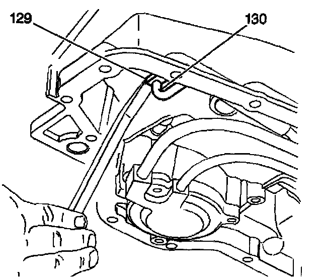 6. Use a large flat-bladed tool in order to gently pry the lube oil pipe retainer (129) from the case.