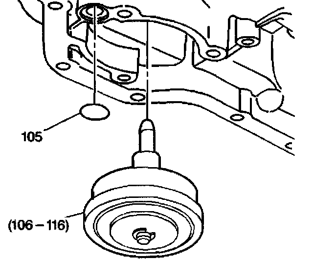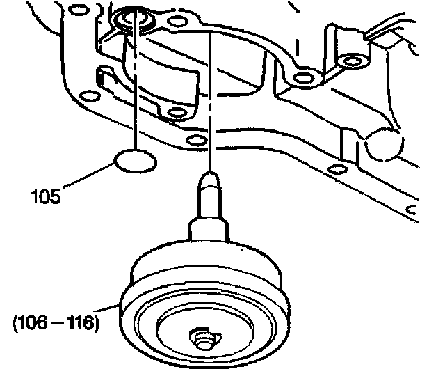 1. Install the manual 2-1 band servo cover gasket (105) into the case. Lubricate the manual 2-1 band servo cover gasket with automatic transmission fluid.
