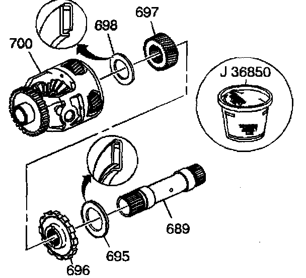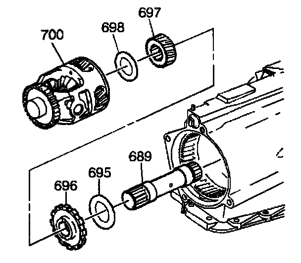 1. Assemble the sun gear thrust bearing (698), the differential carrier sun gear (697), the park gear (696), the internal gear thrust bearing (695) and the sun gear shaft (689) into the differential carrier (700).