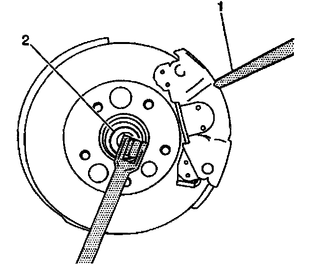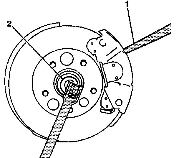 6. Remove the front wheel drive shaft nut (2) and the ramped, 2-piece washer. Insert a drift or a flat-bladed tool (1) through the caliper and into the brake rotor to prevent the rotor from turning, Discard the wheel drive shaft nut.