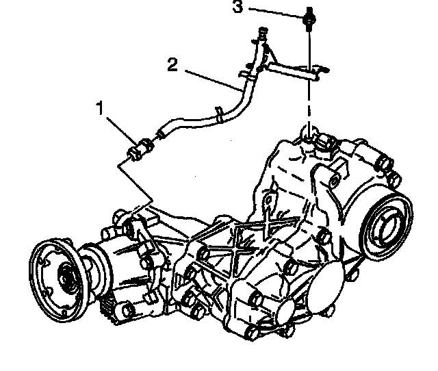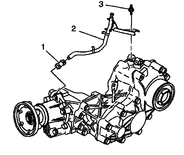 3. Disconnect the vent hose (2) from the retaining bracket on the transfer case assembly.