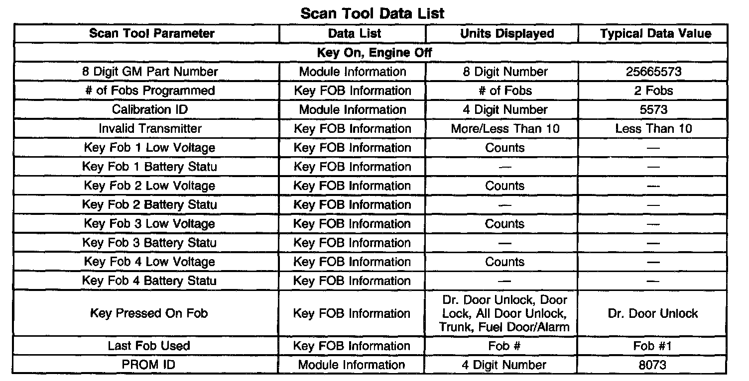 The keyless Entry Scan Tool Data List contains all of the keyless entry related parameters that are available on the scan tool. The parameters in the list are arranged in alphabetical order. The column, Data List, indicates the location of the parameter within the scan tool menu selections. Use the Keyless Entry Scan Tool Data List as directed by a diagnostic table or in order to supplement the diagnostic procedures. Begin all of the diagnostic procedures with Diagnostic System Check - Remote Keyless Entry. Use the Scan Tool Data List only after the following is determined: