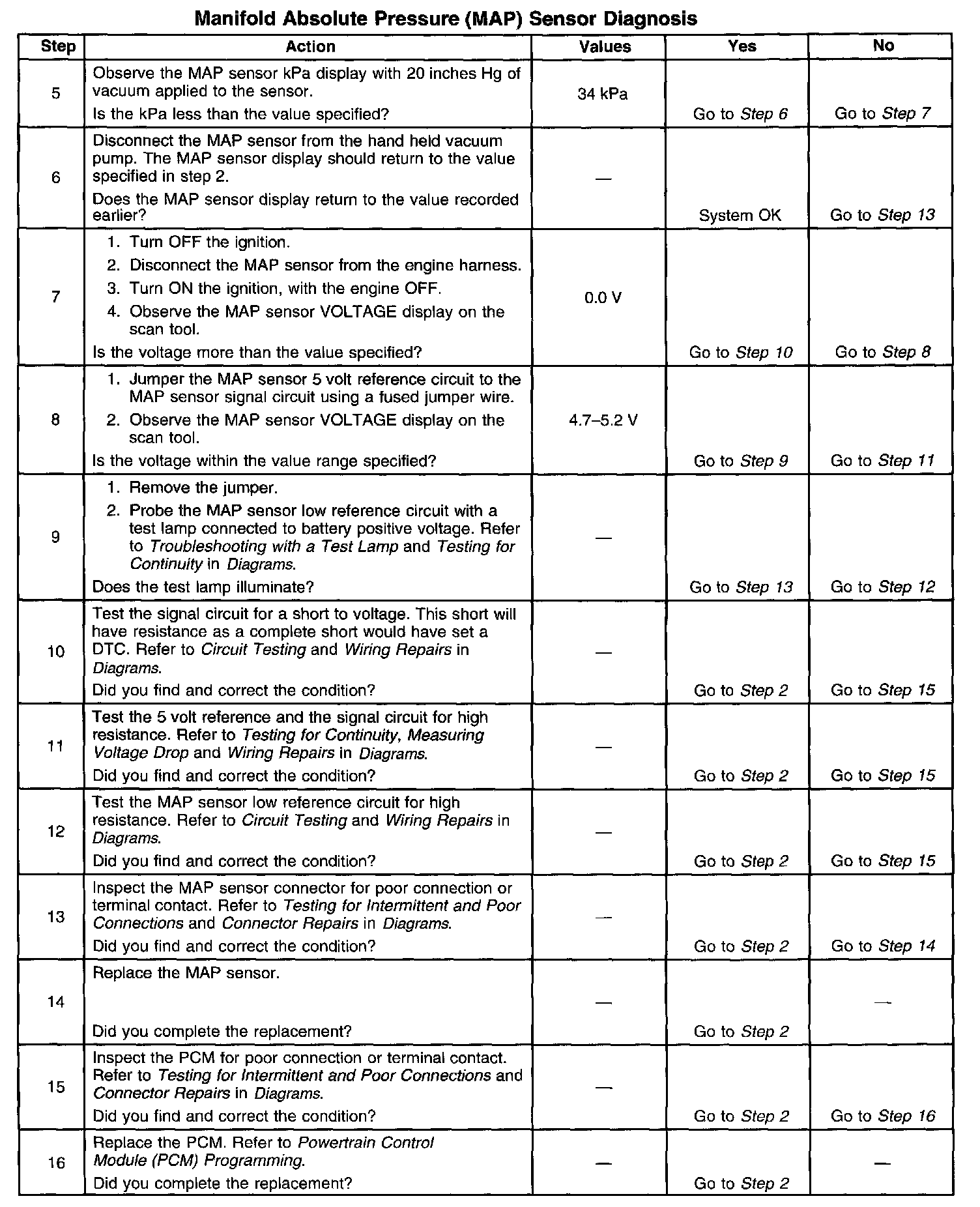 CIRCUIT DESCRIPTIONThe Manifold Absolute Pressure (MAP) sensor responds to pressure changes in the intake manifold which gives an indication of the engine load. The MAP sensor has a 5-volt reference circuit, a low reference circuit, and a signal circuit. The Powertrain Control Module (PCM) supplies 5-volts to the MAP sensor on the 5-volt reference circuit and provides a ground on the low reference circuit. The MAP sensor provides a signal to the PCM on the signal circuit which is relative to the pressure changes in the manifold. With low manifold absolute pressure such as during idle or deceleration, the PCM should detect a low signal voltage. With high manifold absolute pressure such as ignition ON, with the engine OFF or wide-open throttle, the PCM should detect a high signal voltage. Certain vehicle models will also use the MAP sensor in order to calculate the Barometric Pressure (BARO) when the ignition switch is turned ON, with the engine OFF. The BARO reading may also be updated whenever the engine is operated at wide-open throttle. The PCM monitors the MAP sensor signal for voltage outside of the normal range. If the PCM detects a MAP sensor signal voltage that is excessively high, DTC P0108 will set. IF the PCM detects a MAP sensor signal voltage that is excessively low, DTC P0107 will set.