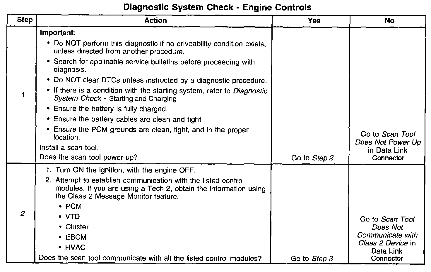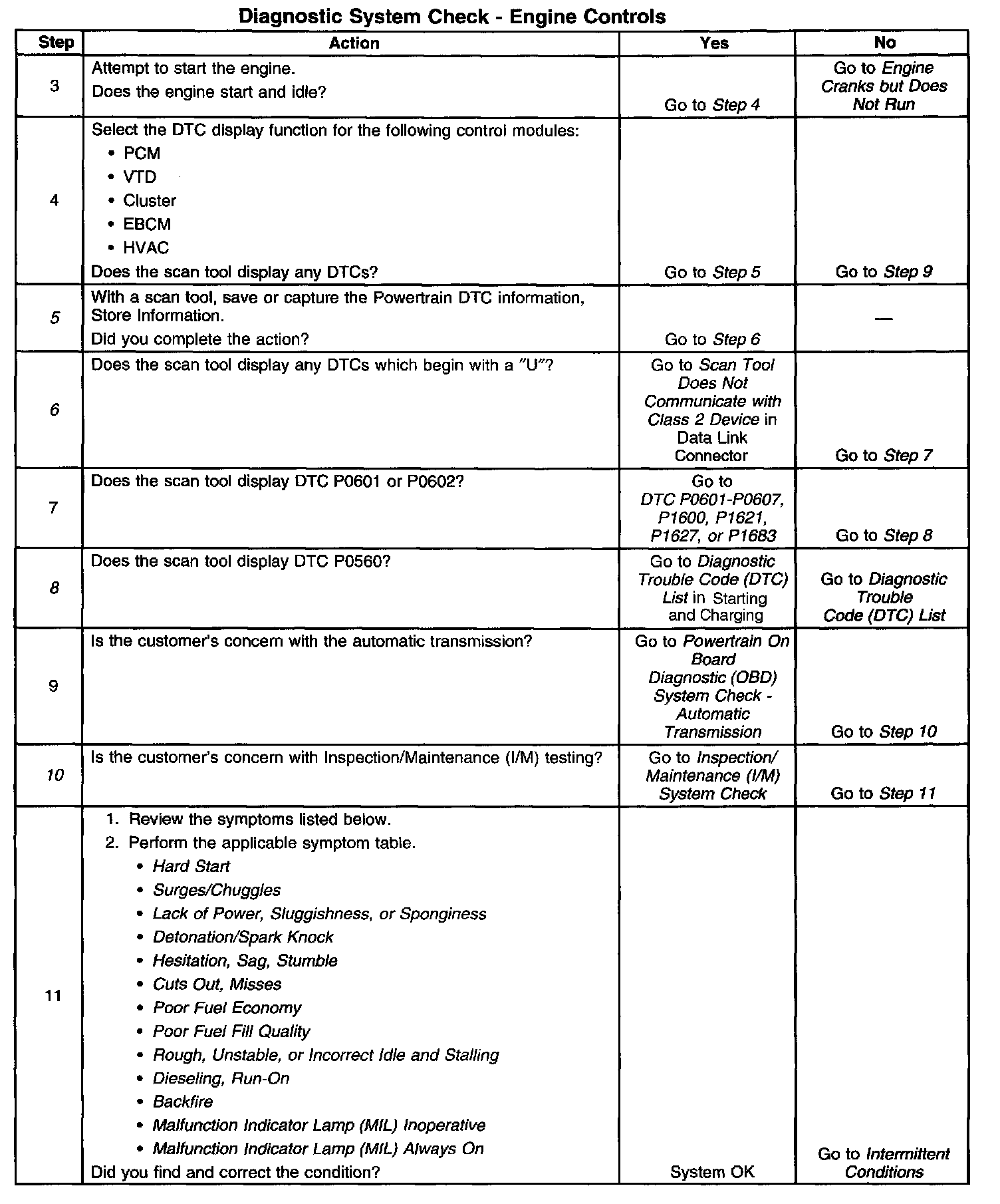 DESCRIPTIONThe Diagnostic System Check is an organized approach to identifying a condition created by an electronic engine control system malfunction. The Diagnostic System Check must be the starting point for any driveability concern. The Diagnostic System Check directs the service technician to the next logical step in diagnosing the concern. Understanding the table and using the table correctly reduces diagnostic time and prevents the replacement of good parts.