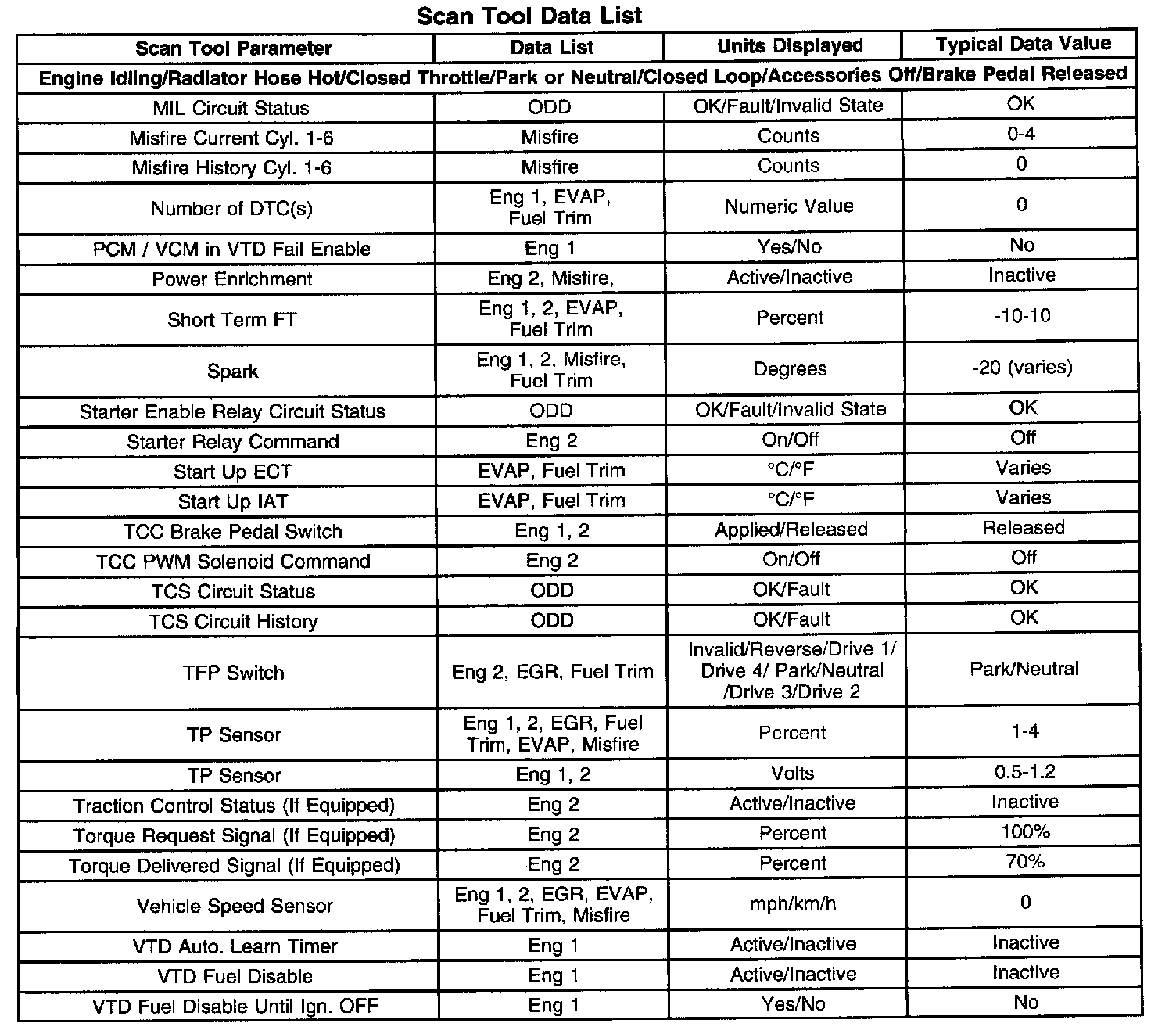 Scan tool values from a properly running engine may be used for comparison with the engine you are diagnosing. The Engine Scan Tool Data List represents values that would be seen on a normally running engine.