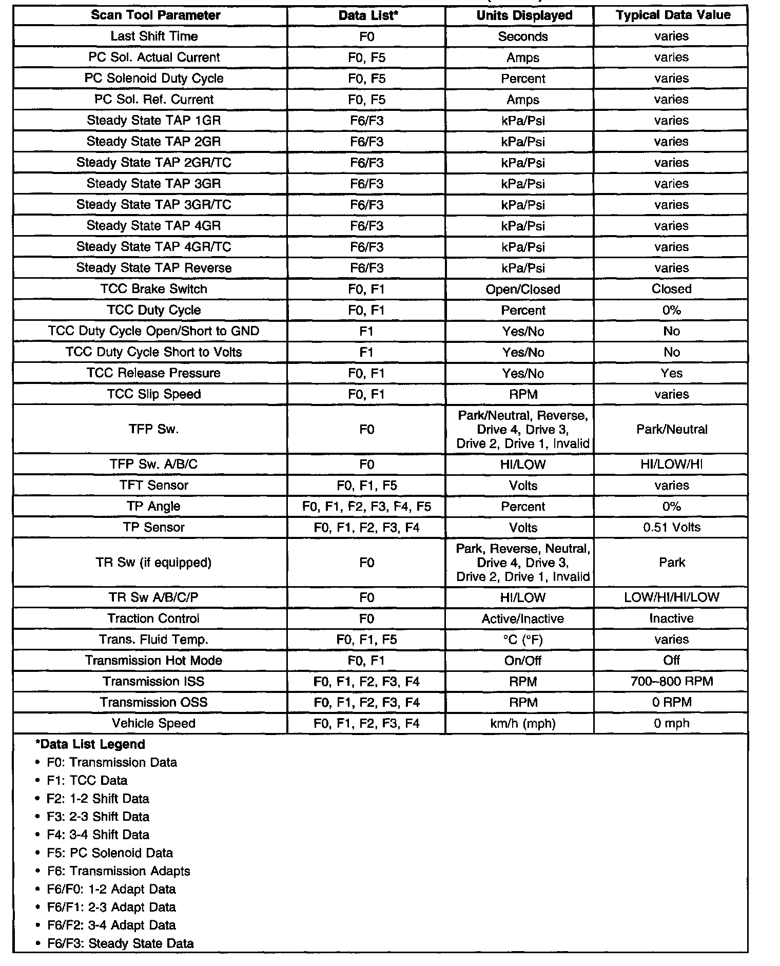 Only the parameters listed below are used in this manual for diagnosing. If a scan tool displays other parameters, the values are not recommended by General Motors for use in diagnosis. Scan tool values below were recorded under the following conditions: