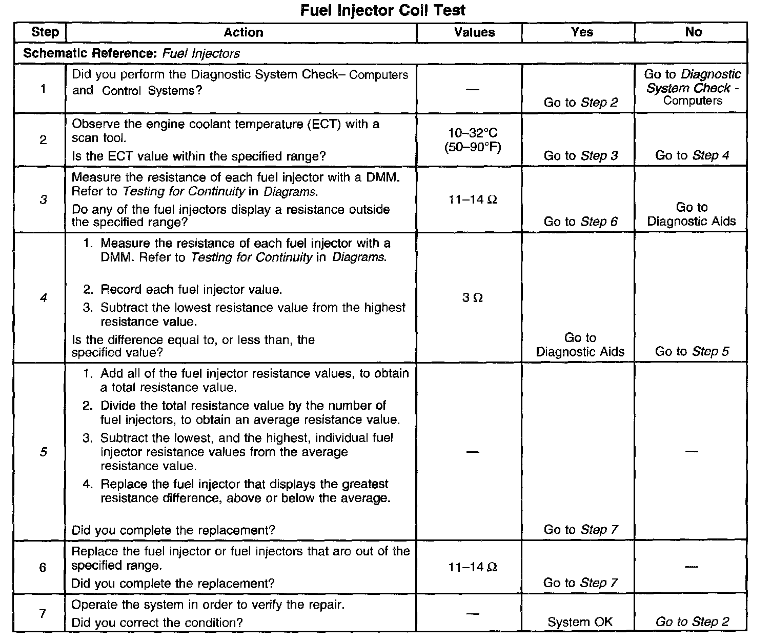 ^ Perform the fuel injector coil test within the conditions of the customers concern. A fuel injector condition may only be apparent at a certain temperature, or under certain conditions.