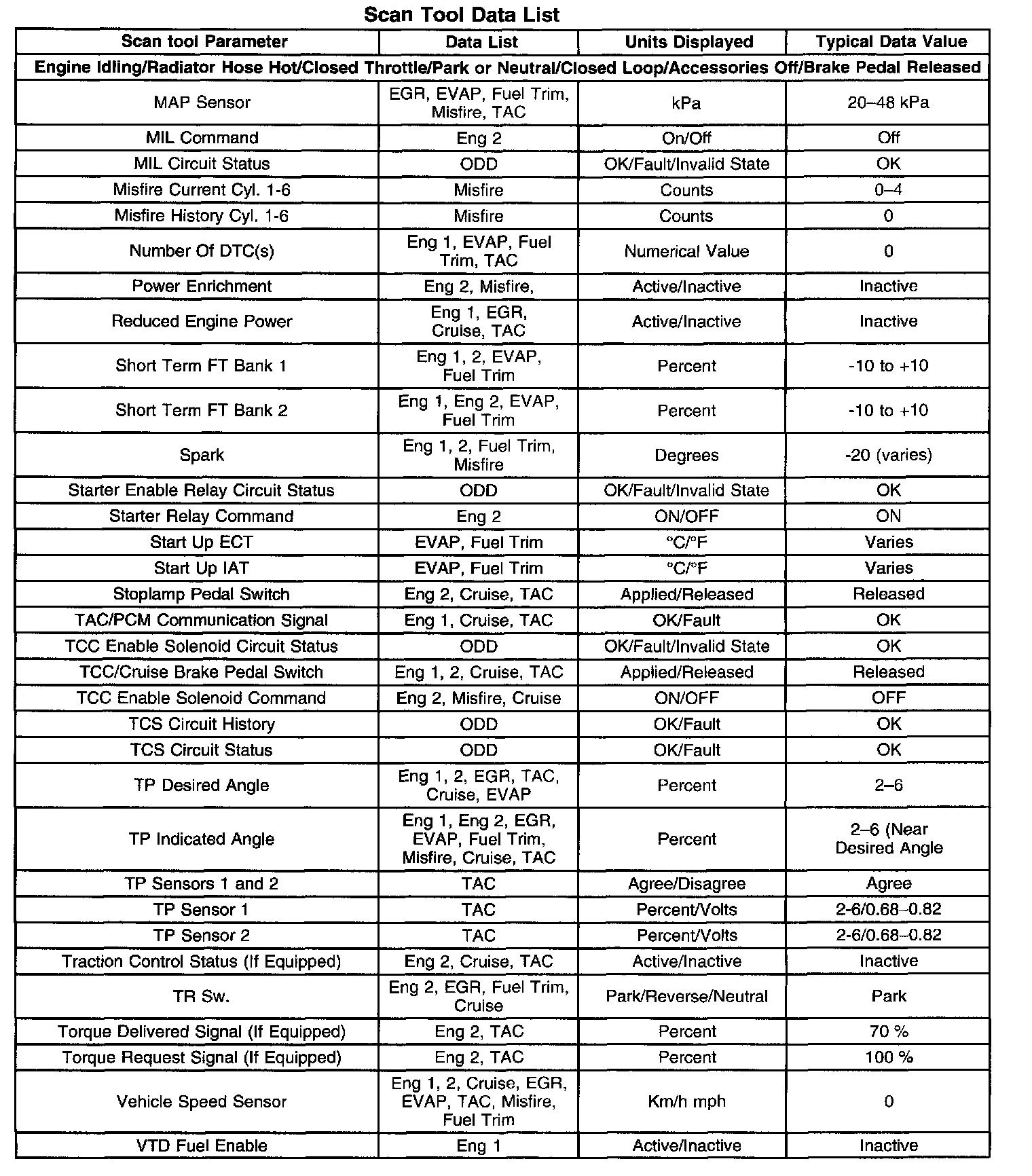The column labeled Data List indicates where a parameter can be located on the scan tool. Refer to the scan tool operating manual for the exact locations of the data lists. The following is a description of each term listed: