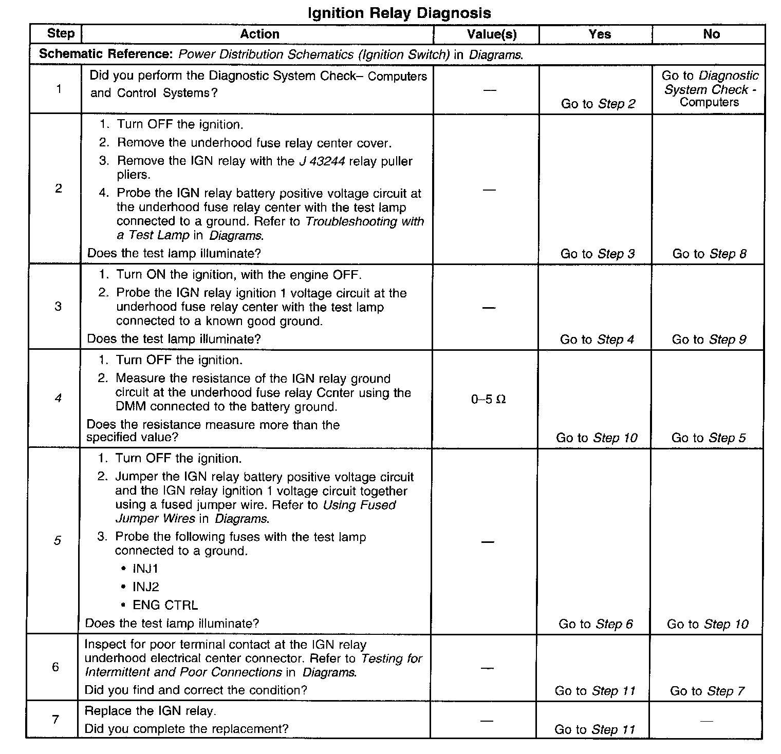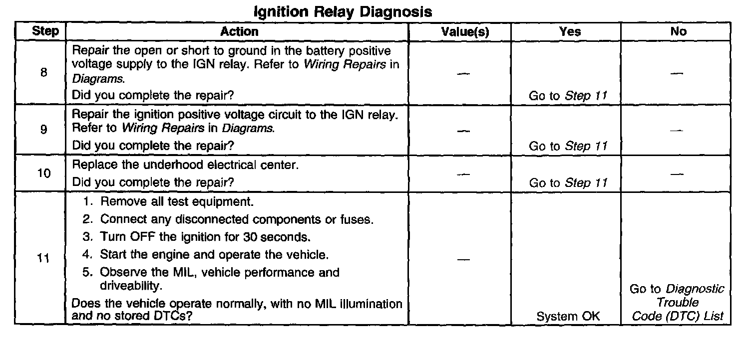 5. This step isolates the circuit from the IGN relay. All of the circuits at the relay are good if the test lamp illuminates.