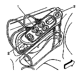 5. Press the accessory switch plate (1) into the door trim panel until the retaining clips (2) are fully engaged.