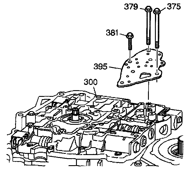2. Install the control valve body bolts (375, 379 and 381) that mount the fluid pressure manual valve position switch to the control valve body (300).